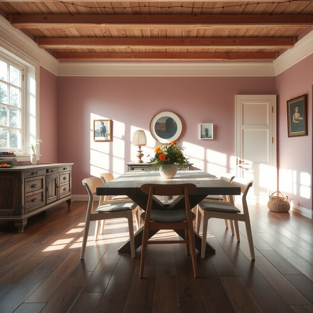 The use of soft colors and vintage accents enhances the charming rural feel, while decorative elements like floral arrangements and antique tableware can elevate the aesthetic. This dining room is perfect for leisurely meals and intimate gatherings, inviting a sense of nostalgia and warmth.
