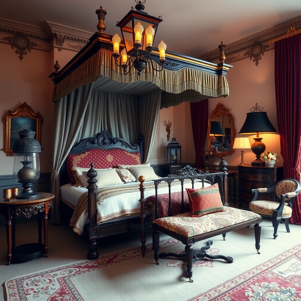Step back in time with a Victorian-style bedroom that exudes vintage elegance. An ornate four-poster bed and antique furniture create a sense of grandeur, while heavy velvet curtains add richness and warmth.