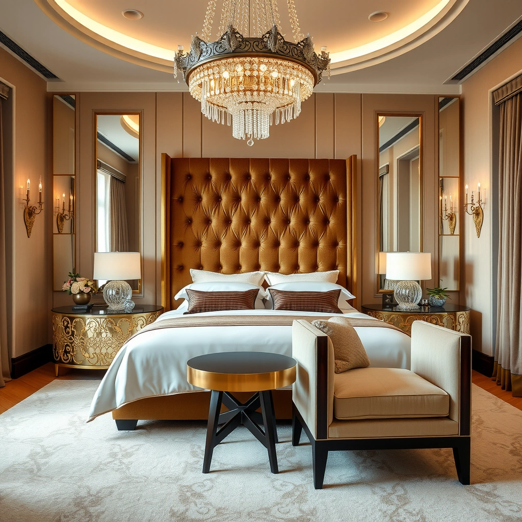 Step into a luxurious haven with this Hollywood Regency bedroom, where the Hollywood Glam palette meets understated beige decor. The standout feature here is a sumptuous velvet headboard that invites you to sink into its embrace.