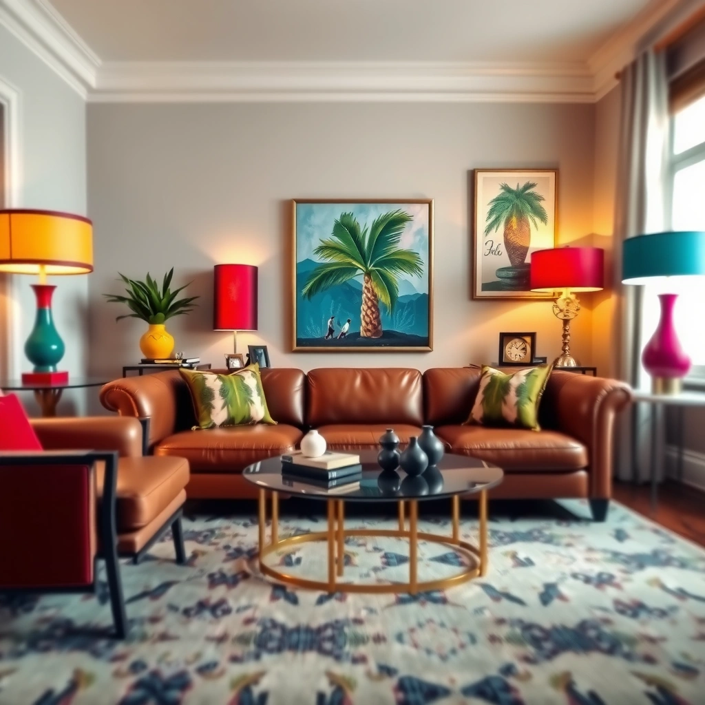 Embrace the vibrant spirit of eclectic design in a living room that celebrates individuality and creativity. The brown leather sofa serves as a versatile base, allowing for a Tropical Brights palette filled with bold colors and playful patterns.