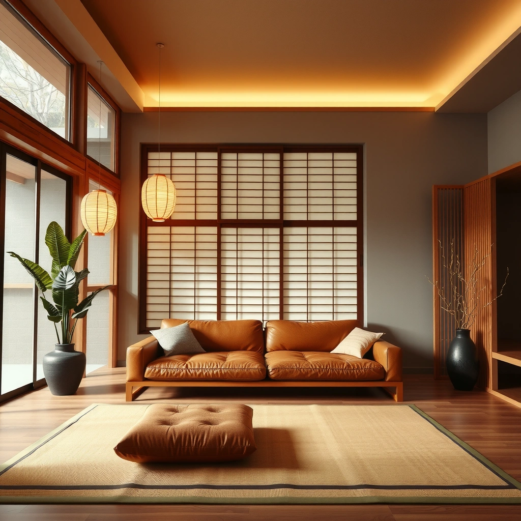 Experience the tranquility of Japanese Zen design in a living room that promotes peace and mindfulness. The brown leather sofa harmonizes with a tatami mat and an Enchanted Forest palette, creating a serene environment.