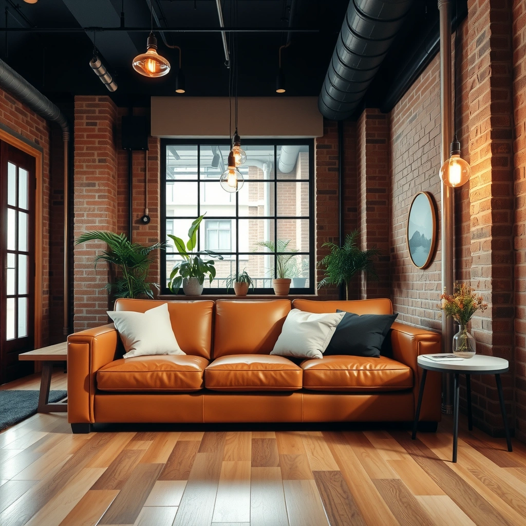 Step into a space that embodies the bold, raw energy of industrial design. The brown leather sofa stands out against the exposed brick walls, creating a striking contrast that speaks to urban sophistication.