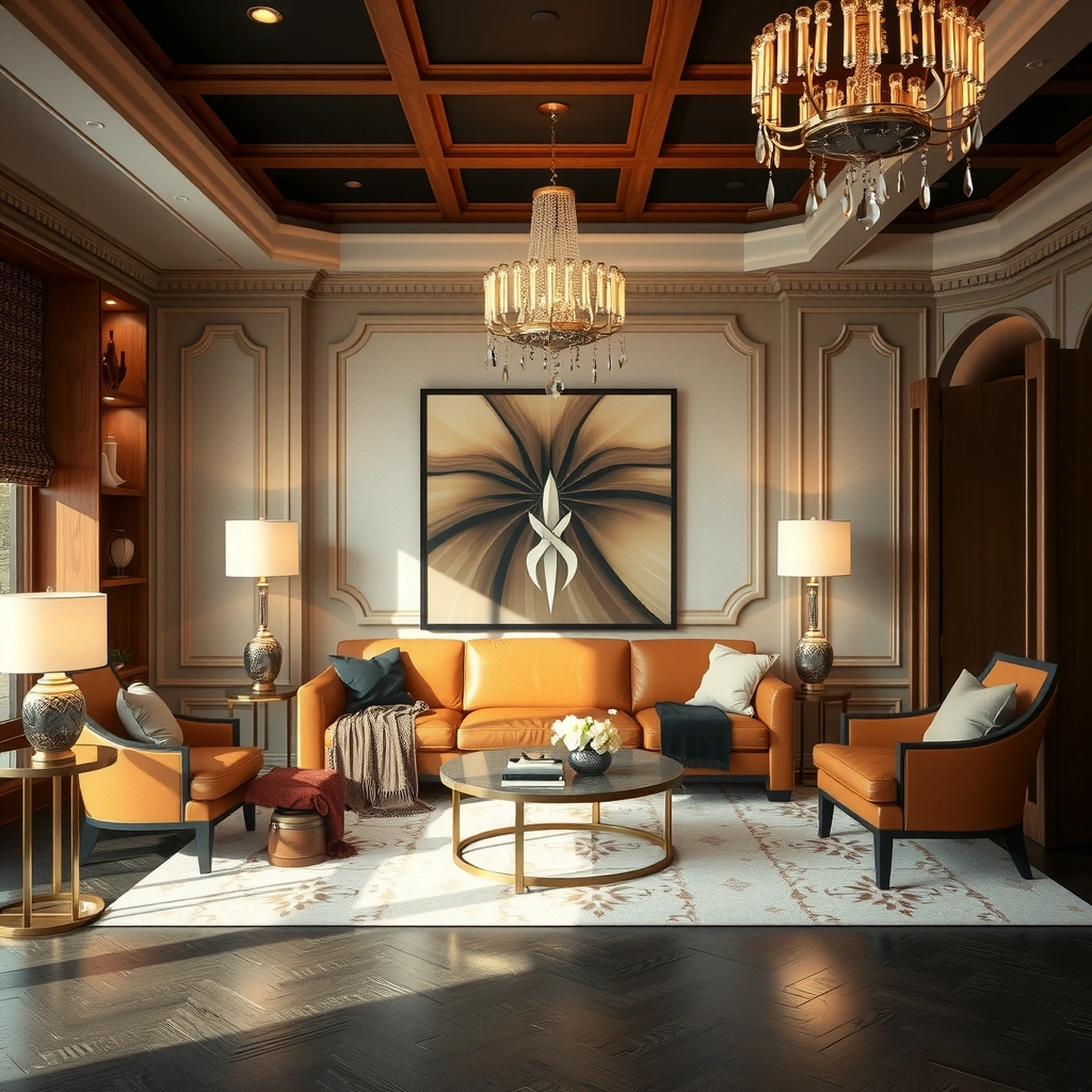 Indulge in the luxurious world of Art Deco with a living room that exudes opulence and sophistication. The brown leather sofa becomes a statement piece, surrounded by geometric patterns and rich textures.