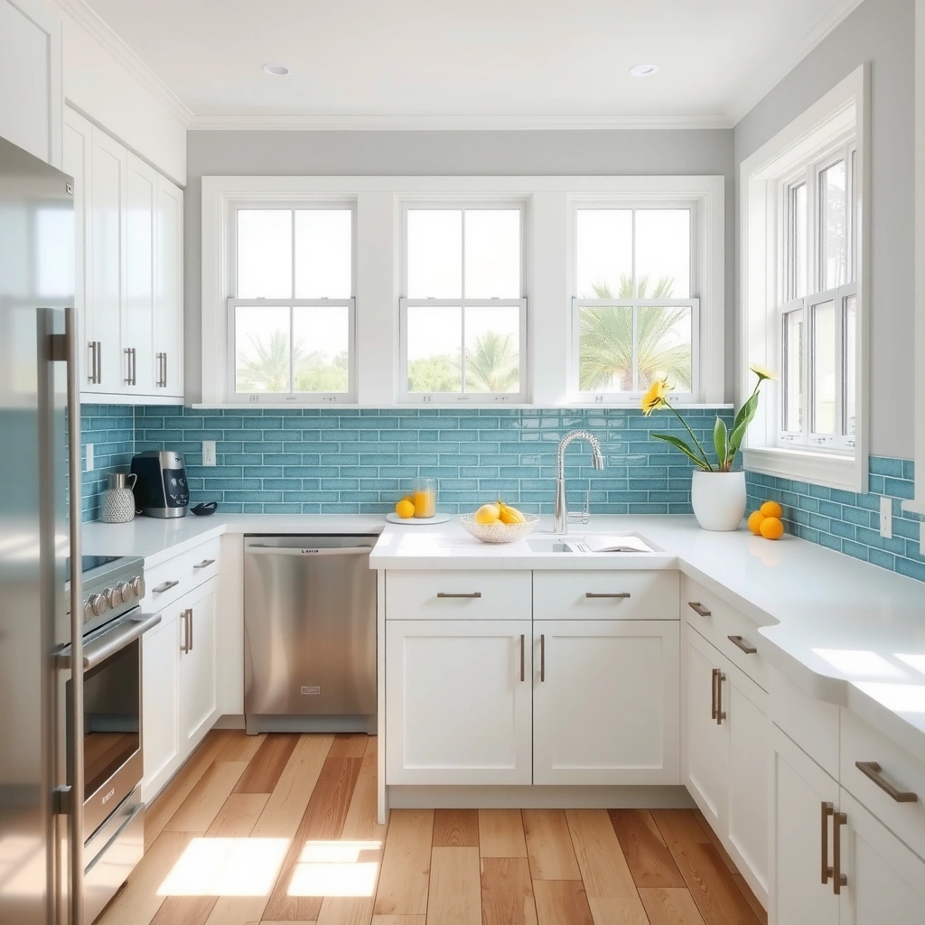 Embrace the tranquility of coastal living in this bright and airy kitchen, featuring white cabinetry and vibrant blue modern kitchen tiles. The Coastal Breeze palette evokes feelings of relaxation, with natural light streaming in from large windows that frame views of the outdoors.