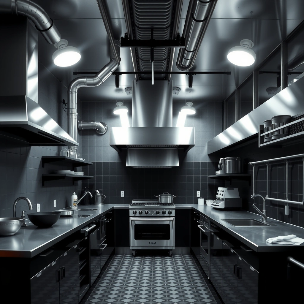 This professional kitchen embraces an Industrial style with a Monochrome Noir palette that exudes sophistication and strength. Stainless steel appliances and exposed pipes create an edgy aesthetic, while harsh direct lighting from overhead spotlights emphasizes the clean lines.