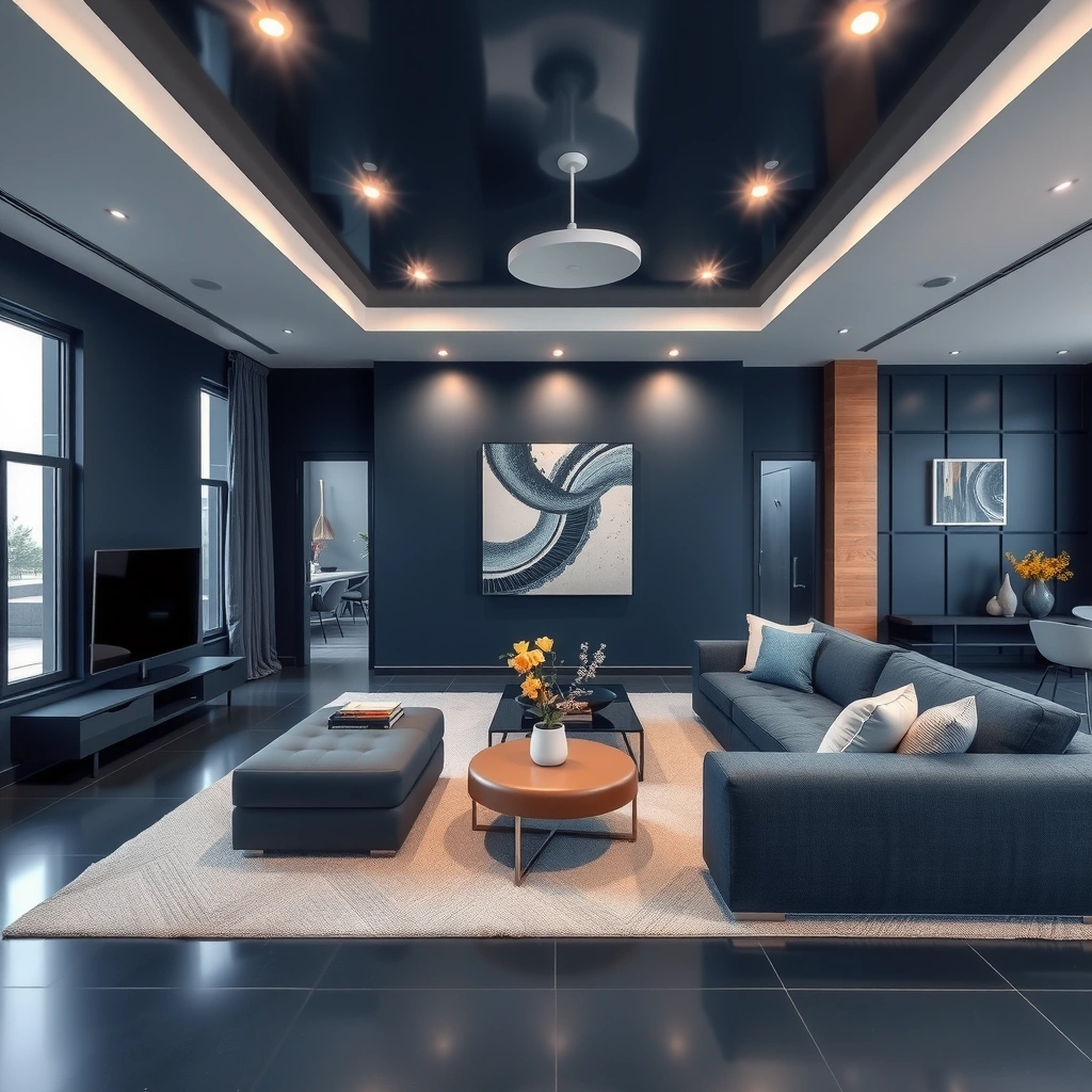 Elements like vintage industrial lighting and abstract art contribute to the overall theme, resulting in a navy blue living room that feels both edgy and sophisticated. This design is perfect for those who appreciate a modern lifestyle with a touch of rugged charm.