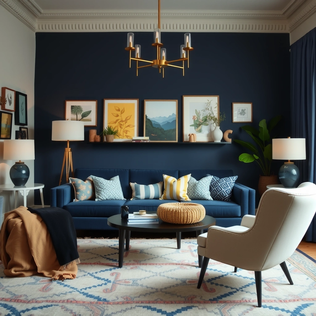 The Eclectic style celebrates diversity and creativity, allowing for a vibrant mix of textures, colors, and patterns. Envision a navy blue sofa amidst a kaleidoscope of textiles and decor items, layered with various lamps that provide warm, inviting light, inspired by Justina Blakeney.
