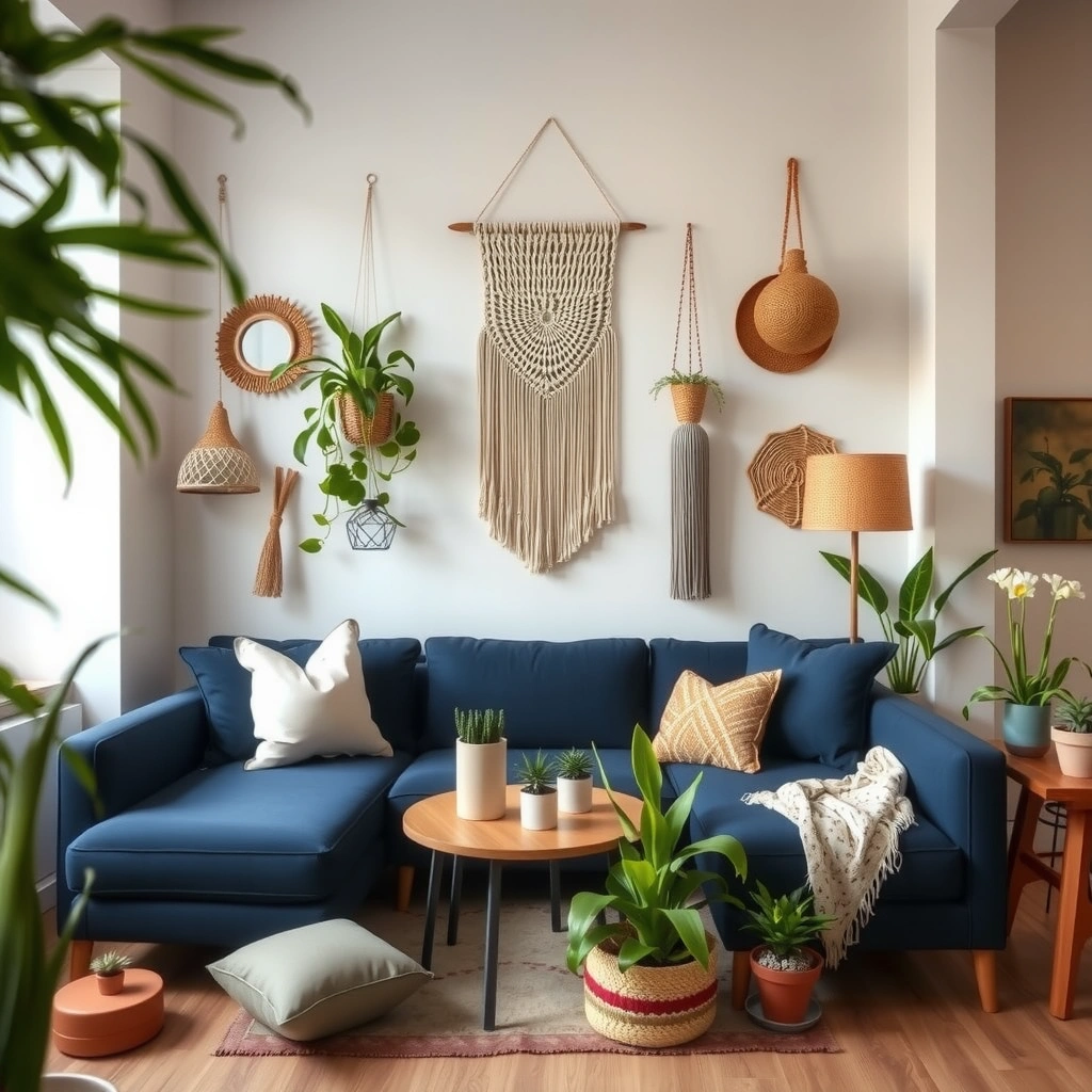 The Bohemian style celebrates creativity and individuality, allowing for a vibrant mix of patterns, textures, and colors. Envision a navy blue sofa surrounded by macrame wall hangings and an abundance of potted plants, creating a lush and inviting environment.