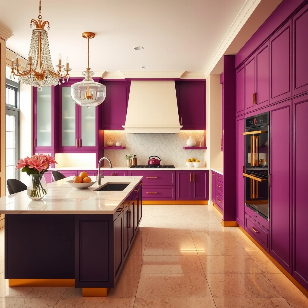 In a glamorous kitchen designed in the Hollywood Regency style, high-gloss purple kitchen cabinets exude luxury. A marble island and gold accents create a sophisticated contrast, while warm ambient lighting from chandeliers adds a touch of opulence.