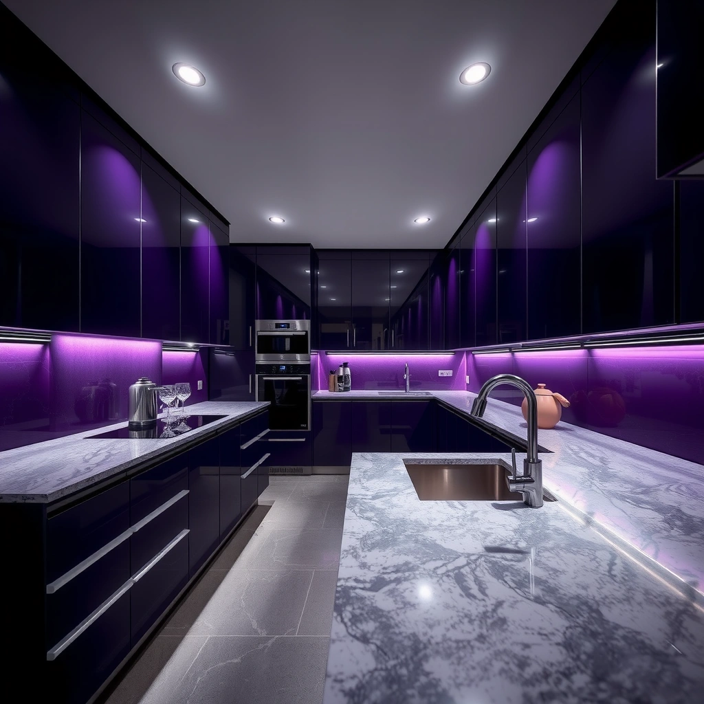 This aesthetic thrives on sleek surfaces and clean lines, with glossy finishes that reflect light beautifully. The interplay between the deep purple and metallic elements adds a contemporary twist, making the kitchen not just a cooking area but a stylish focal point in the home.