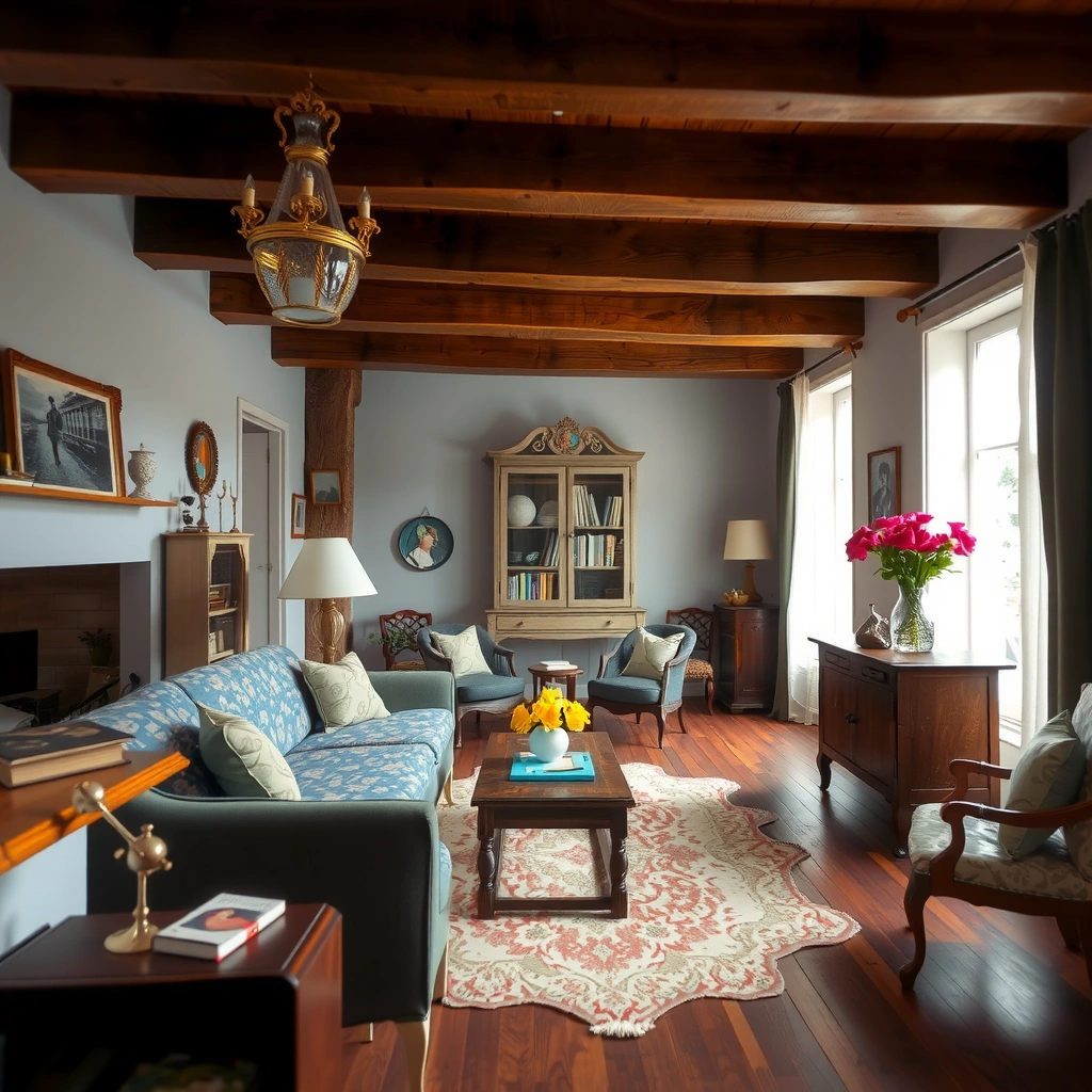 The royal blue floral couch adds a touch of color while complementing the vintage aesthetic. Decor elements such as rustic wooden accents and delicate floral arrangements enhance the overall ambiance, making this living room a perfect blend of comfort and sophistication.