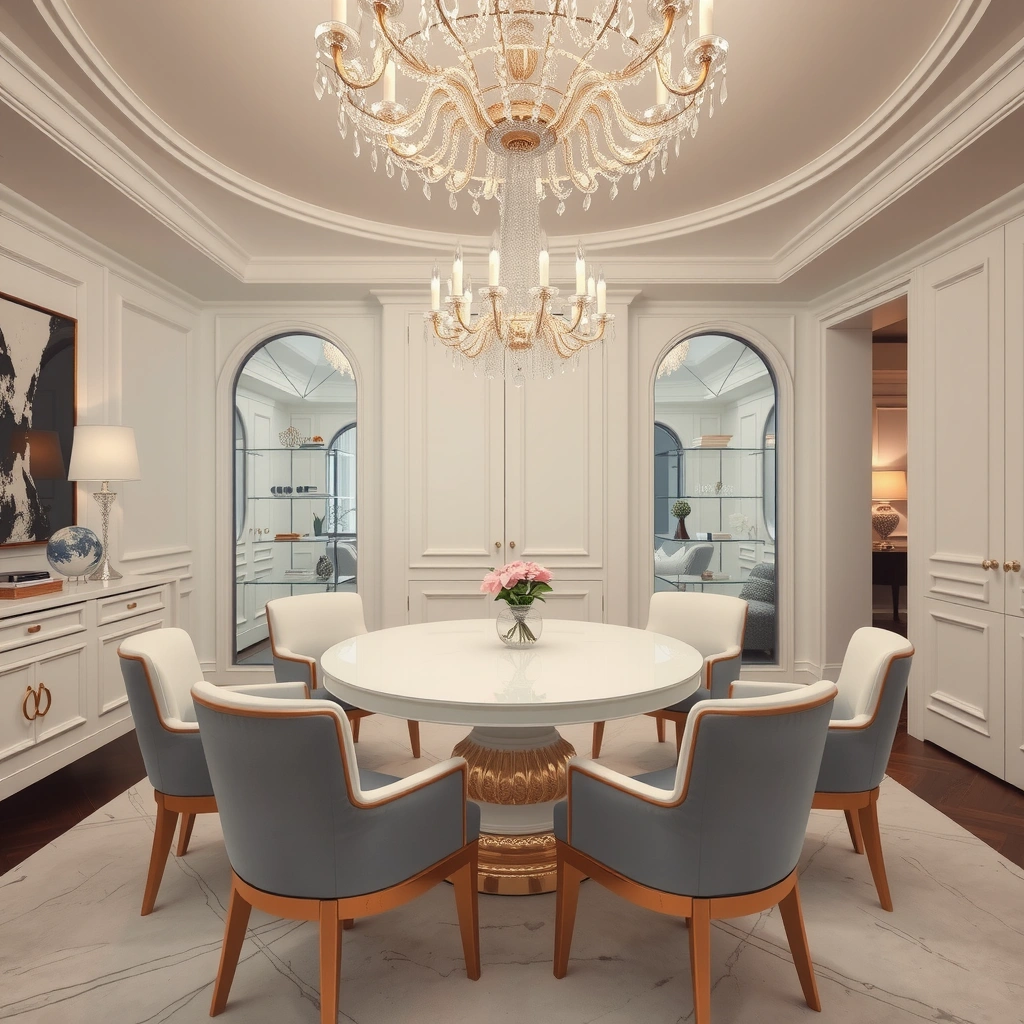 Step into a world of glamour with an Art Deco style dining room, where a mirrored table reflects light and creates an illusion of grandeur. Plush velvet chairs in rich colors invite comfort and luxury, while warm ambient lighting from geometric pendant fixtures adds to the opulence of the space.