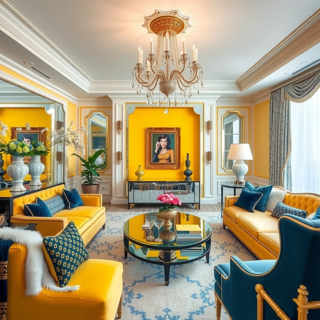 For a touch of glamour, a Hollywood Regency-style living room showcases mirrored furniture and glamorous accents. The Hollywood Glam palette features the vibrant interplay of yellow and blue, creating a dazzling effect that exudes luxury.